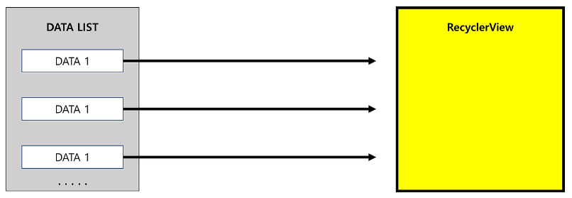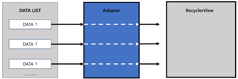 RecyclerView는 데이터 목록을 아이템 단위의 View로 생성해서 화면에 표시하기 위해 Adapter를 사용한다.