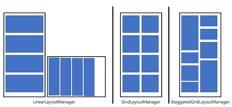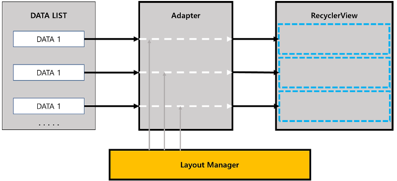 Adapter에 의해 생성된 View 객체를 어떤 방식으로 나열할지 결정하기 위해 Layout Manager를 사용한다.